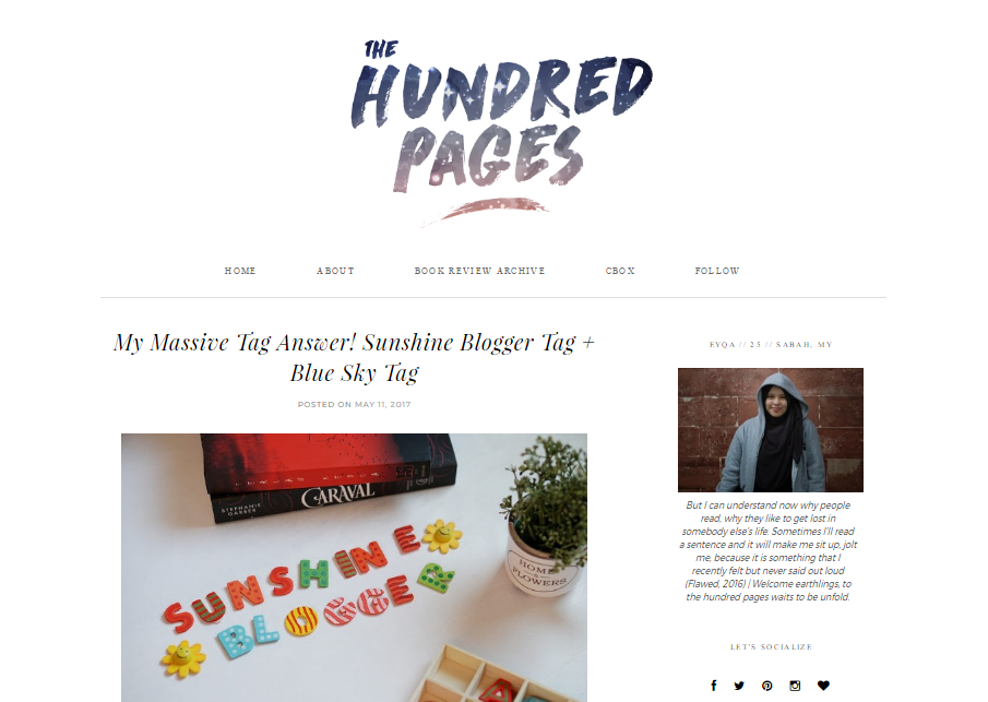 For The Sunshine Blogger Award, I award it to the new bloggers I come to made friend with. On the other hand, The Blue Sky tag was given to new bloggers that come to my blog, sort of making new friendship. Now, apparently, I have been tagged back by for The Blue Sky by a lovely bibliophile blogger named Eyqa. Eyqa is sho naishhhhhh *insert heart eyes here*